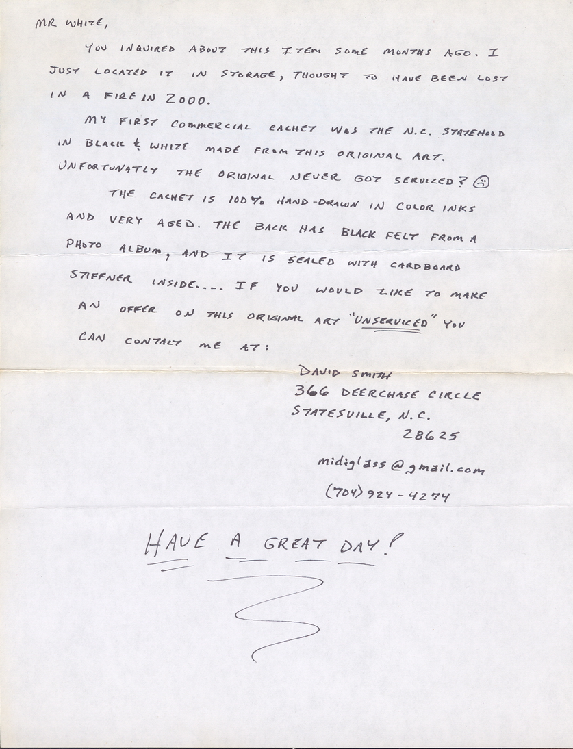 214.. | 2347 | NFD |  | CM: C#: MTD: QTY: DSC: | Smith Cachet Studio 4 hdn hcd 1 Letter to John White (c2009) stating this was the original artwork for the first cachet (2), and is not serviced.; Non-FDOI |