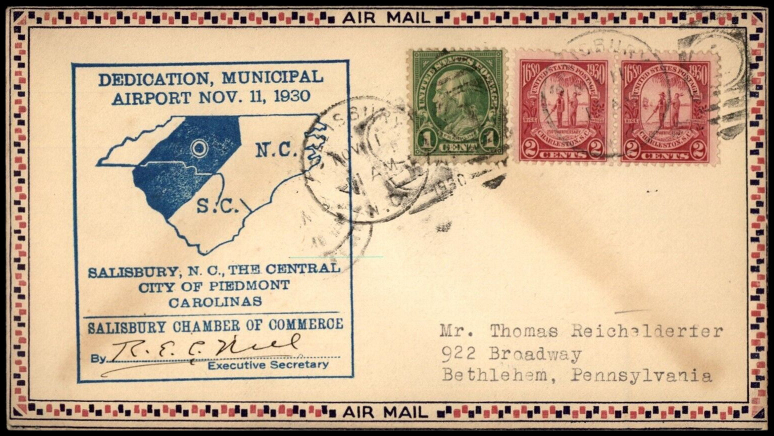 295 | | 19301111 |  | CM: C#: MTD: QTY: DSC: | Unknown 1 rsc 1 UNK01; Salisbury NC Municipal Airport Dedication; blue; Roessler airmail envelope |
