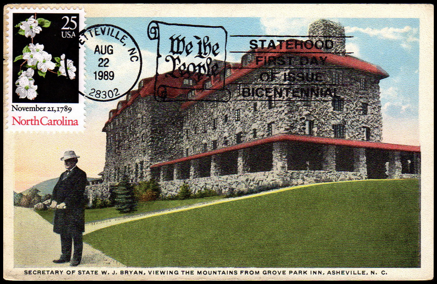 169 | 2347 | PPC |  | CM: C#: MTD: QTY: DSC: | Asheville Post Card Company 14 B-387; Secretary of State W. J. Bryan viewing the mountains from Grove Park Inn, Asheville, N.C.; 1915 Asheville Flag MC on back; PPC |