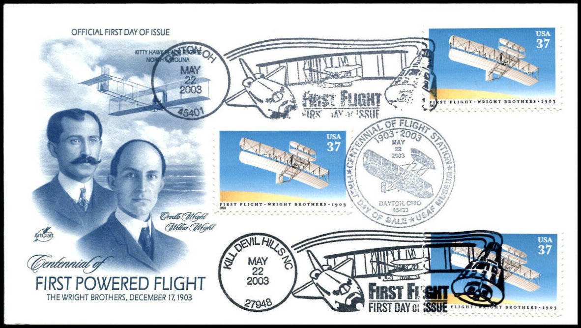 2251 | | 20031217 |  | CM: C#: MTD: QTY: DSC: | Unknown 1 100 Wright Brothers 100th Anniversary; Dual cancels - Kitty Hawk NC Wright Brothers Station and Kill Devil Hills NC Wright Brothers Memorial Station |