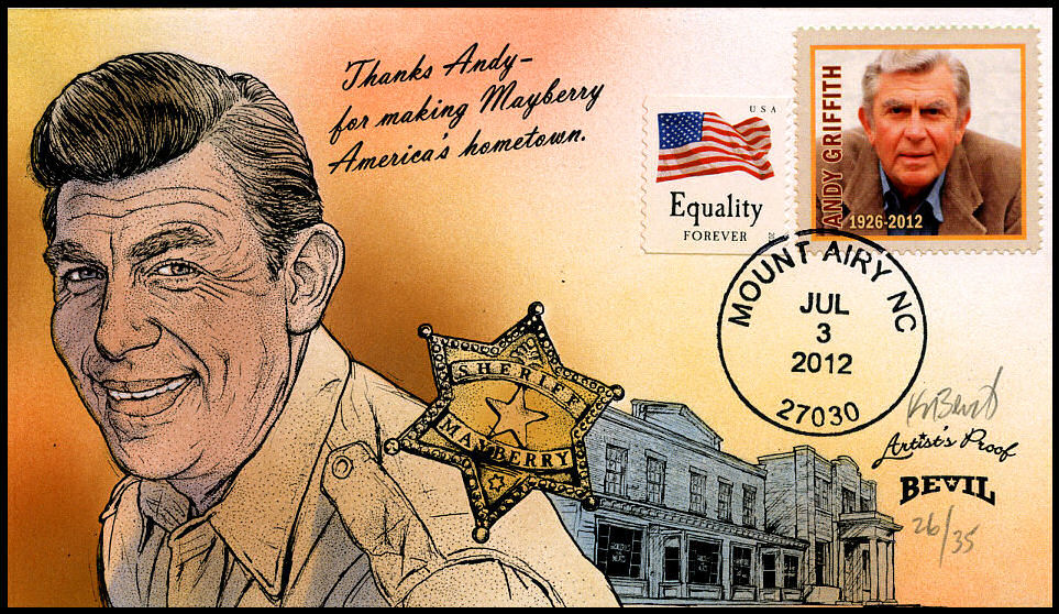 2261 | | 20120703 |  | CM: C#: MTD: QTY: DSC: | Bevil Cachets 4 hpd Andy Griffith Mourning Cover; Day of Death; died in Manteo, NC on this day; postmarked Mount Airy, NC; AFDCS Variety; Event |