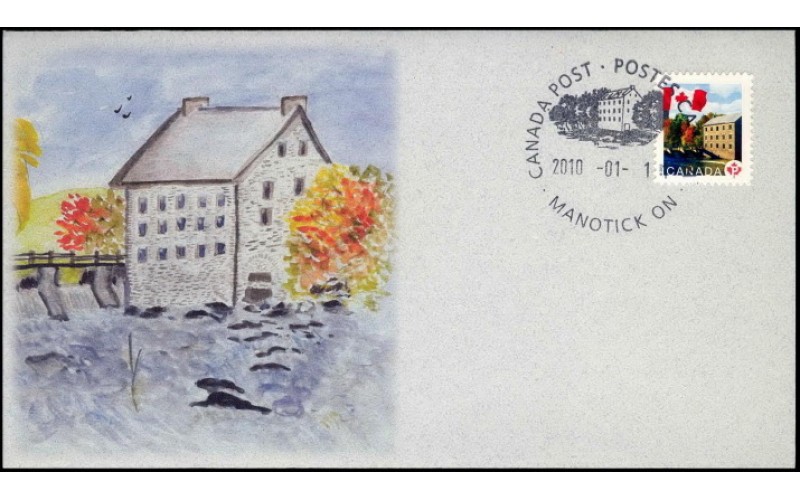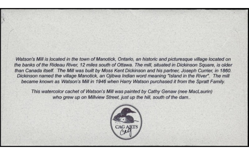The artist grew up in Manotick in a house that had a view of Watson's Mill and the dam, therefore the First Day Cover is limited to the Watson's Mill stamp from the Canadian Mills booklet pane.
