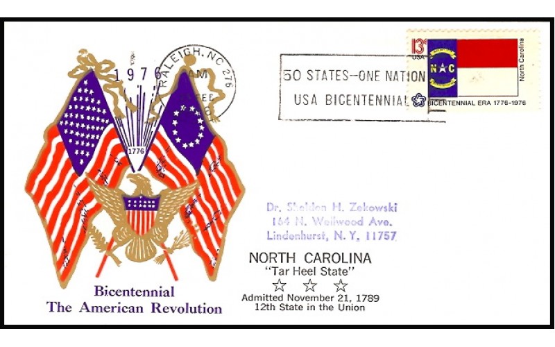 Crossed flags GP with black text for North Carolina stamp; UO Raleigh, NC slogan machine cancellation.