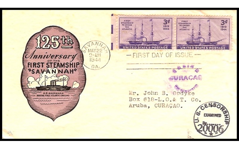World War II Censor Markings; Back-stamped with Examiner mark as on front, and 6/12/1944 cancel at Oranje-Stad, Aruba