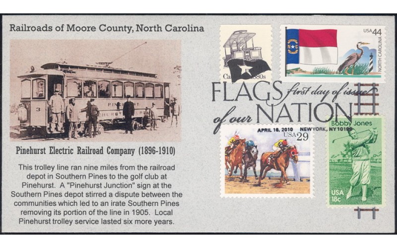 This trolley line ran nine miles from the railroad depot in Southern Pines to the golf club at Pinehurst. A "Pinehurst Junction" sign at the Southern Pines depot stirred a dispute between the communities which led to an irate Southern Pines removing its portion of the line in 1905. Local Pinehurst trolley service lasted six more years.