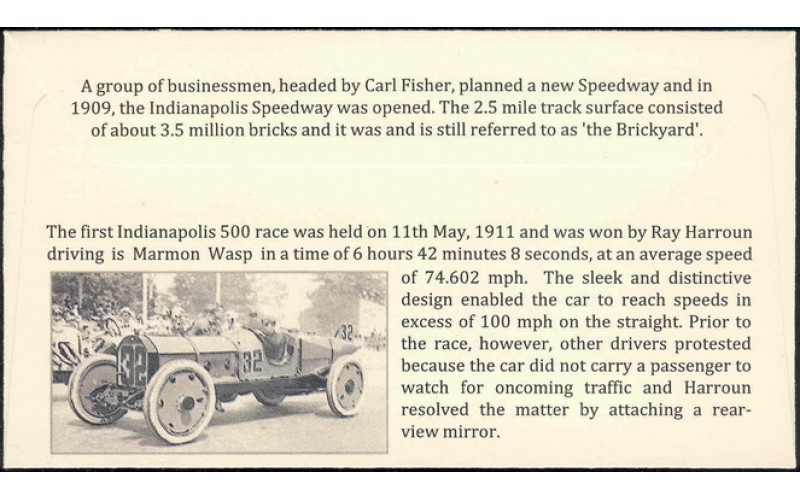 Text of Cachet, Back:A group of businessmen, headed by Carl Fisher, planned a new Speedway and in