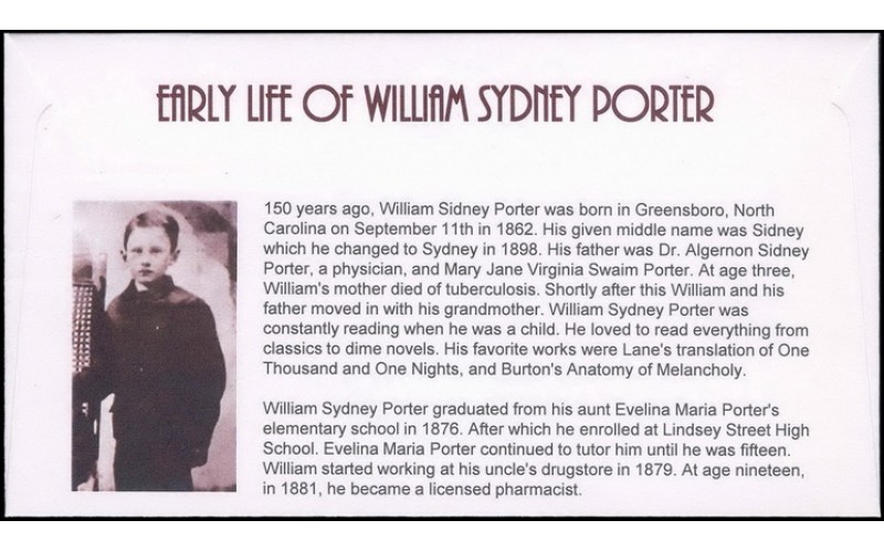 (Picture of William at an early age at left) 150 years ago, William Sidney Porter was born in Greensboro, North Carolina on September 11th in 1862. His given middle name was Sidney which he changed to Sydney in 1898. His father was Dr. Algernon Sidney Porter, a physician, and Mary Jane Virginia Swaim Porter. At age three, William's mother died of tuberculosis. Shortly after this William and his father moved in with his grandmother. William Sydney Porter was constantly reading when he was a child. He loved to read everything from classics to dime novels. His favorite works were Lane's translation of One Thousand and One Nights, and Burton's Anatomy of Melancholy.