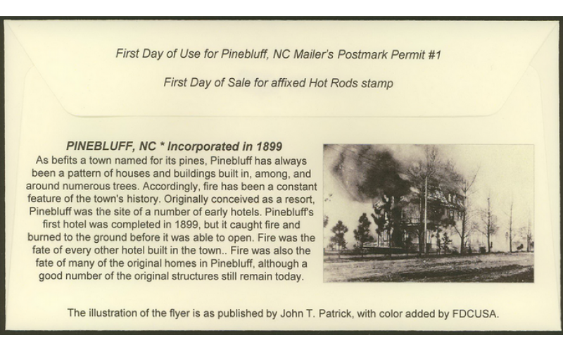 Text of Cachet, Back:First Day of Use for Pinebluff, NC Mailer’s Postmark Permit #1