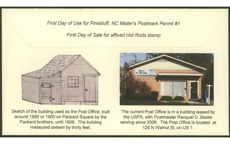 Text of Cachet, Back:First Day of Use for Pinebluff, NC Mailer’s Postmark Permit #1