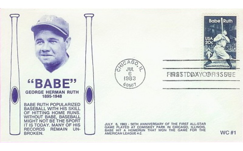 2046 WC101 Babe Ruth, FIRST, FDOI mc *Slogan stamped TWICE*