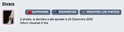 La gestion des propriétés d’un album est accessible en cliquant sur "Propriétés" à côté de la vignette qui représente un album en particulier.