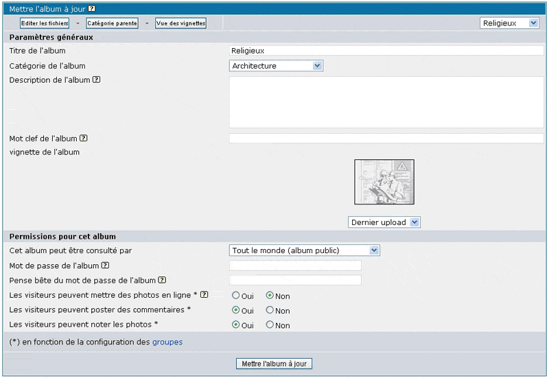 Le bouton "Editer les fichiers" vous fera parvenir directement à la page Modifier les images qui est accessibles via le bouton "Modifier les photos" à côté de la vignette qui représente un album sur la page d'index